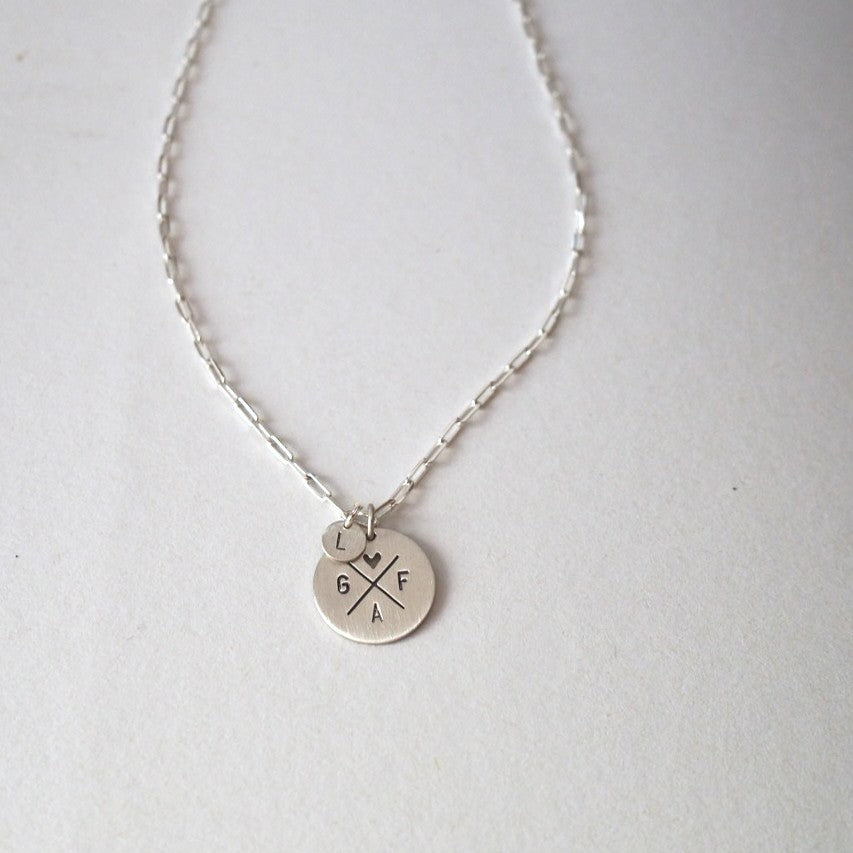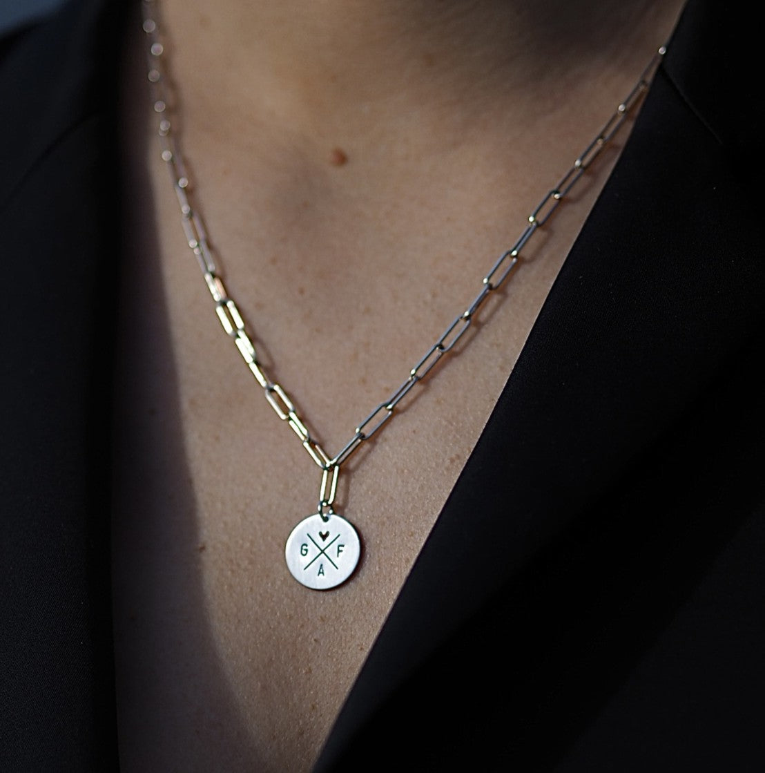 Der Anhänger bietet Platz für bis zu 4 Initialen. Insgesamt sind mit dem kleinen Zusatzanhänger bis zu 5 Initialen möglich. Auch ein kleines Herz kann integriert werden.