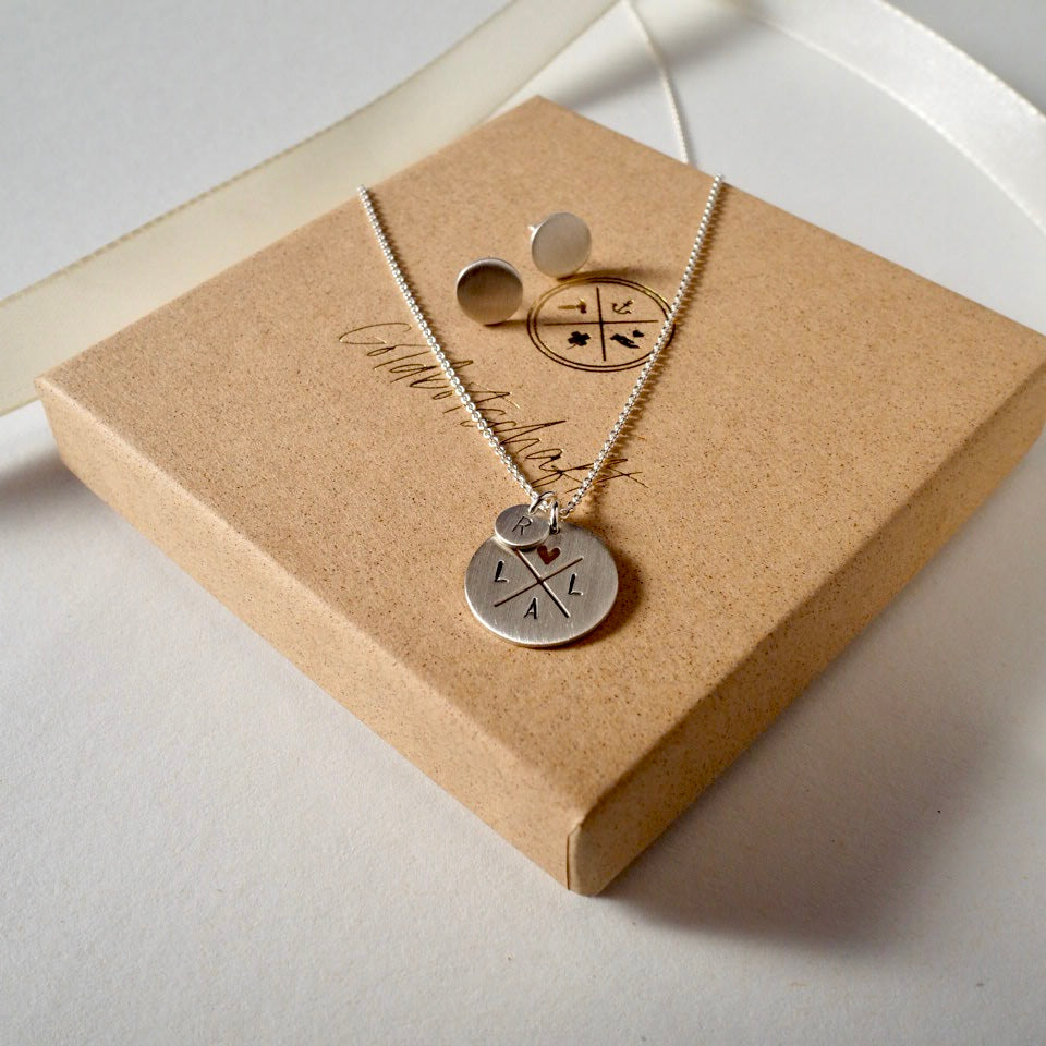 Das Set besteht aus der Familienkette mit 4 Initialen und einem kleinen Zusatzanhänger mit Herzchen sowie einem Paar Ohrstecker. Das Set wird aus 925er Silber gefertigt.