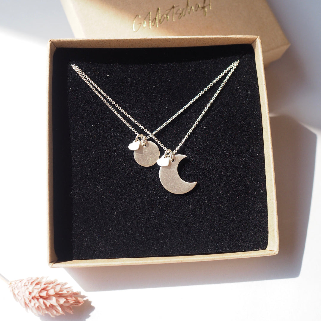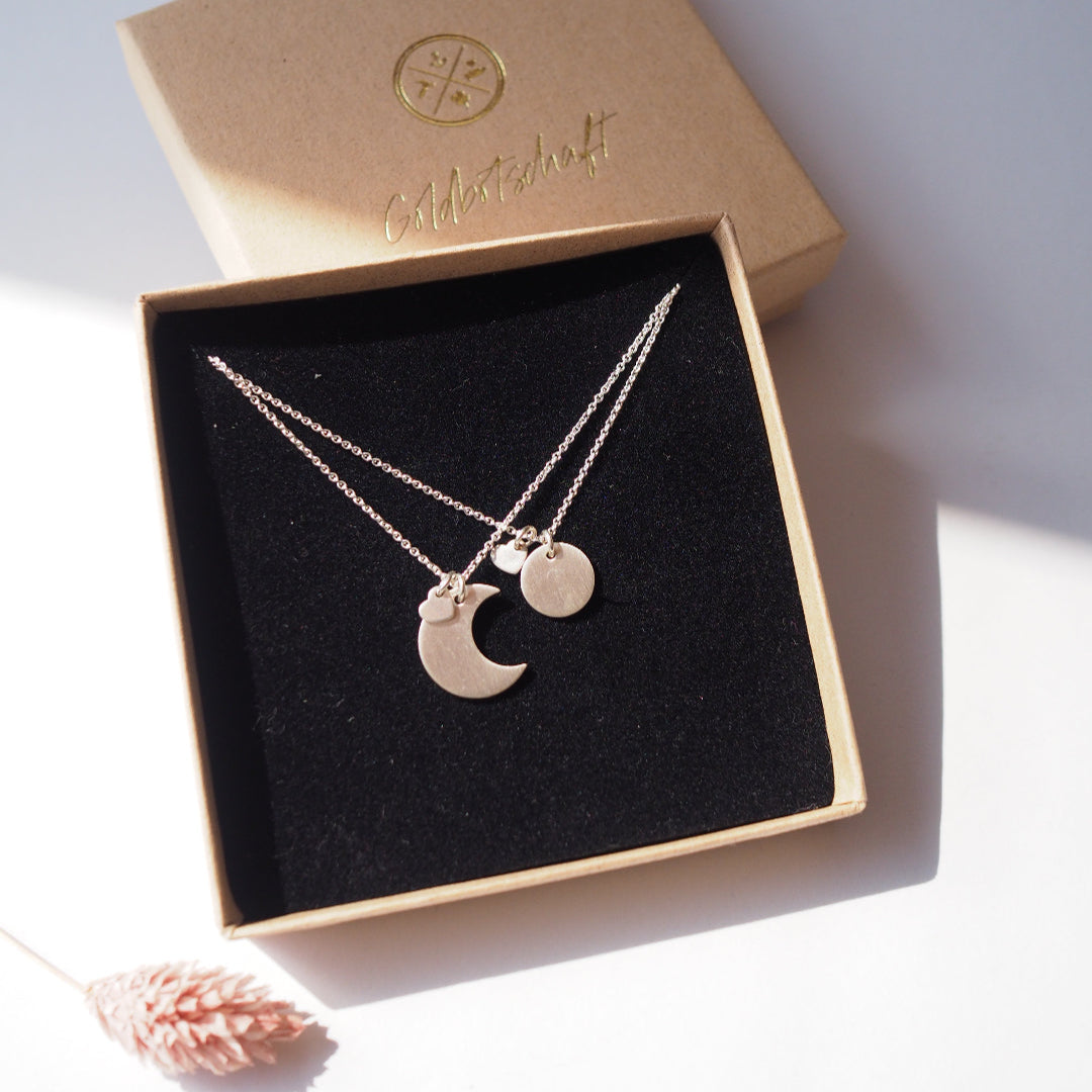 Mit diesem Set zeigt ihr Eure Verbundenheit nach außen. Jede Kette mit zwei zarten Anhängern an einer ebenso zarten und eleganten Kette.
