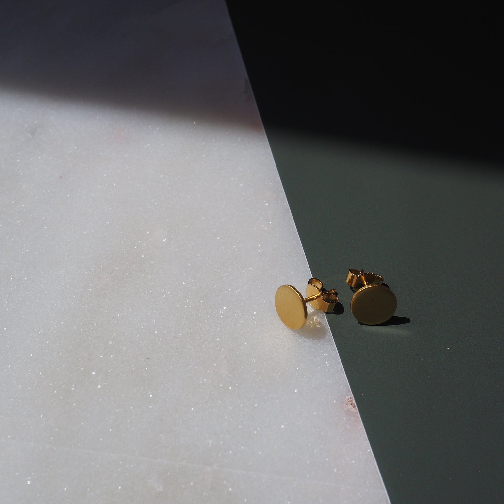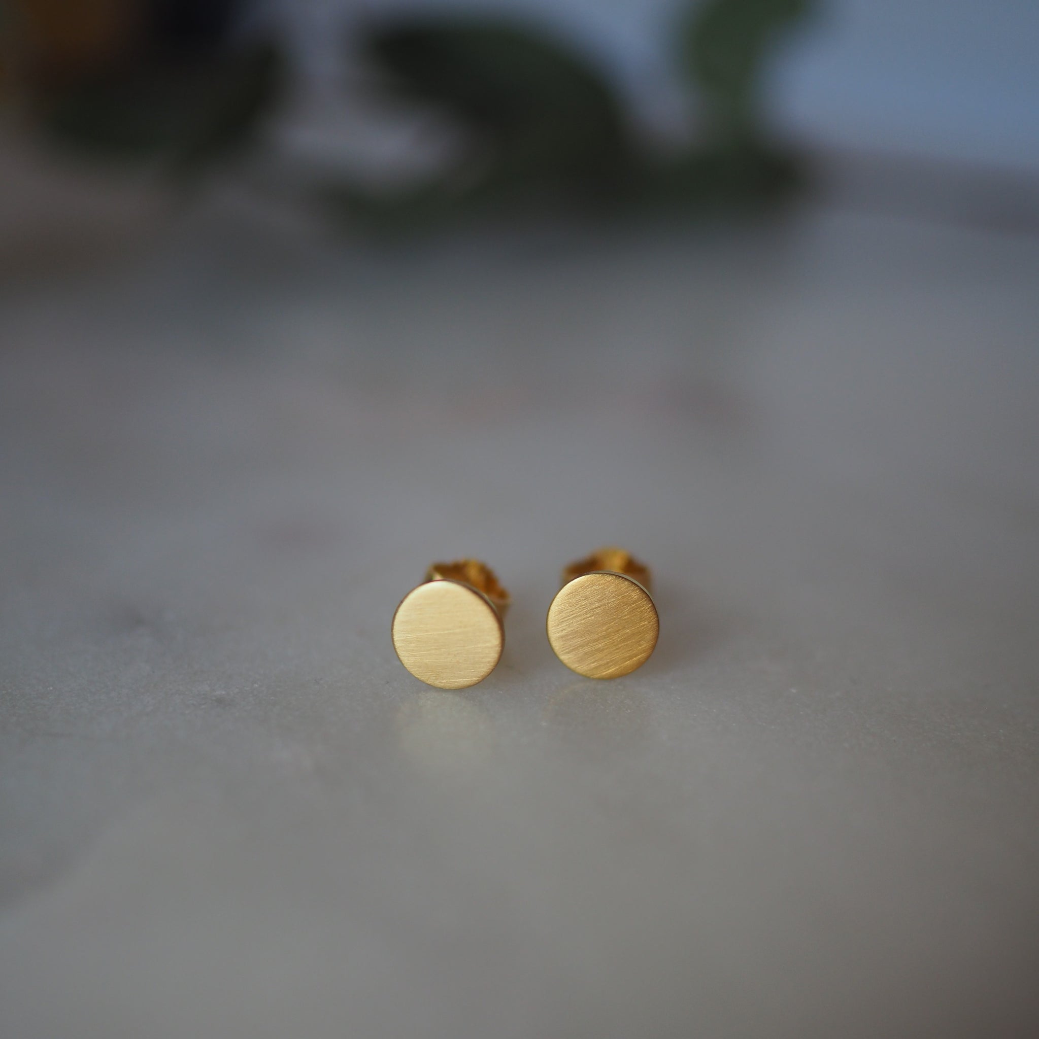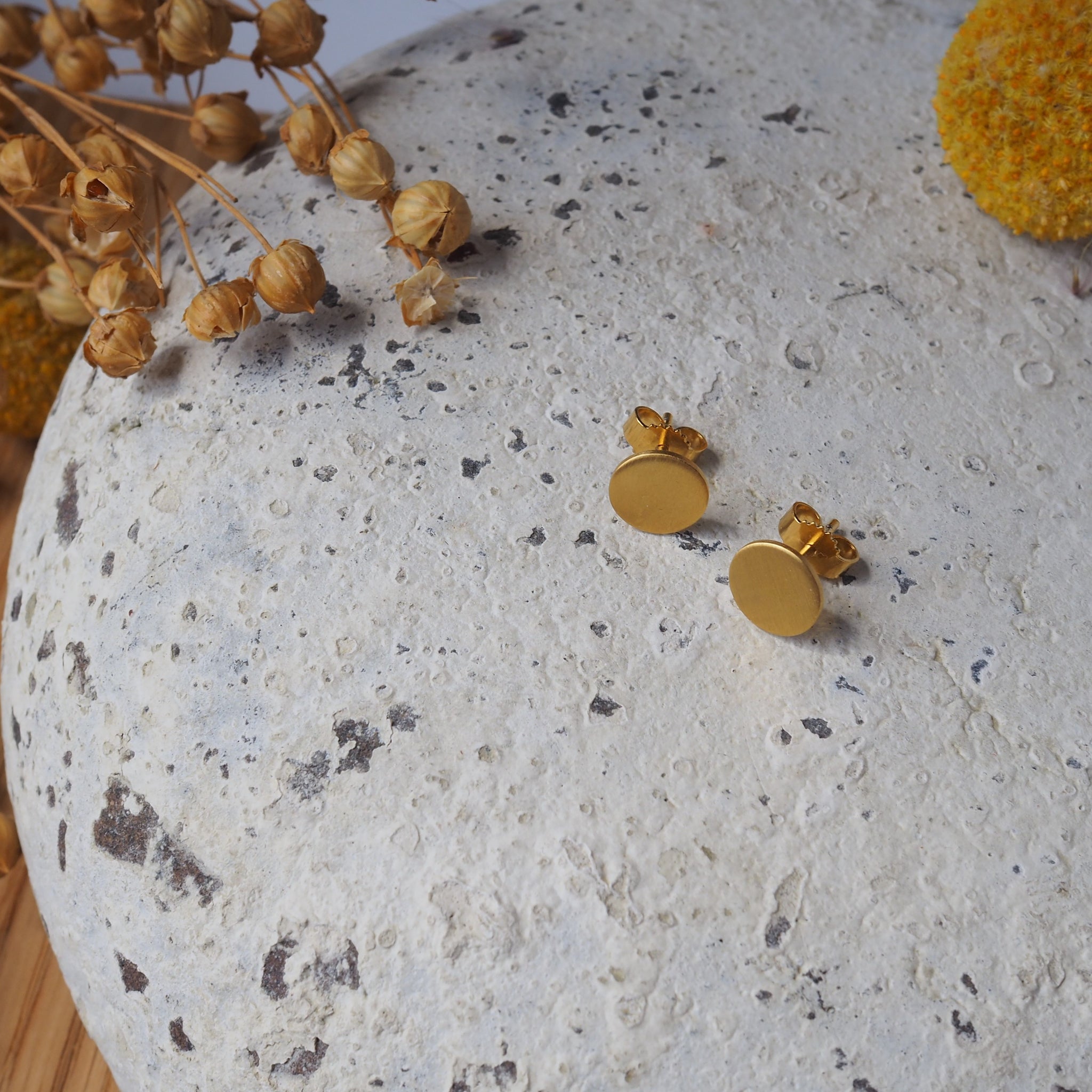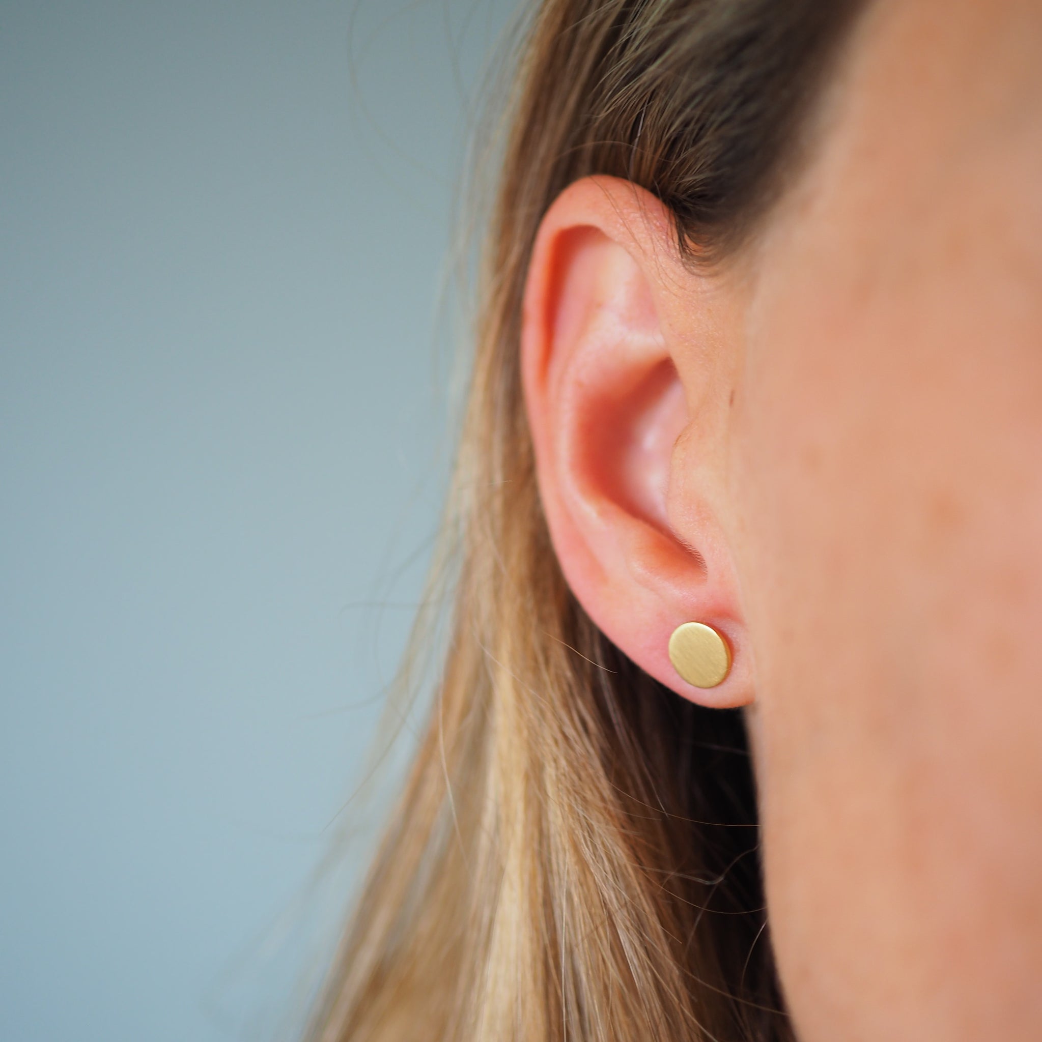 Die Stecker sind aus Sterling Silber gefertigt, werden anschließend mit 750er Gold vergoldet und erhalten dann ihr mattes Finish. Die Größe der Stecker ist 8mm im Durchmesser, so sind sie gut aber dezent sichtbar.