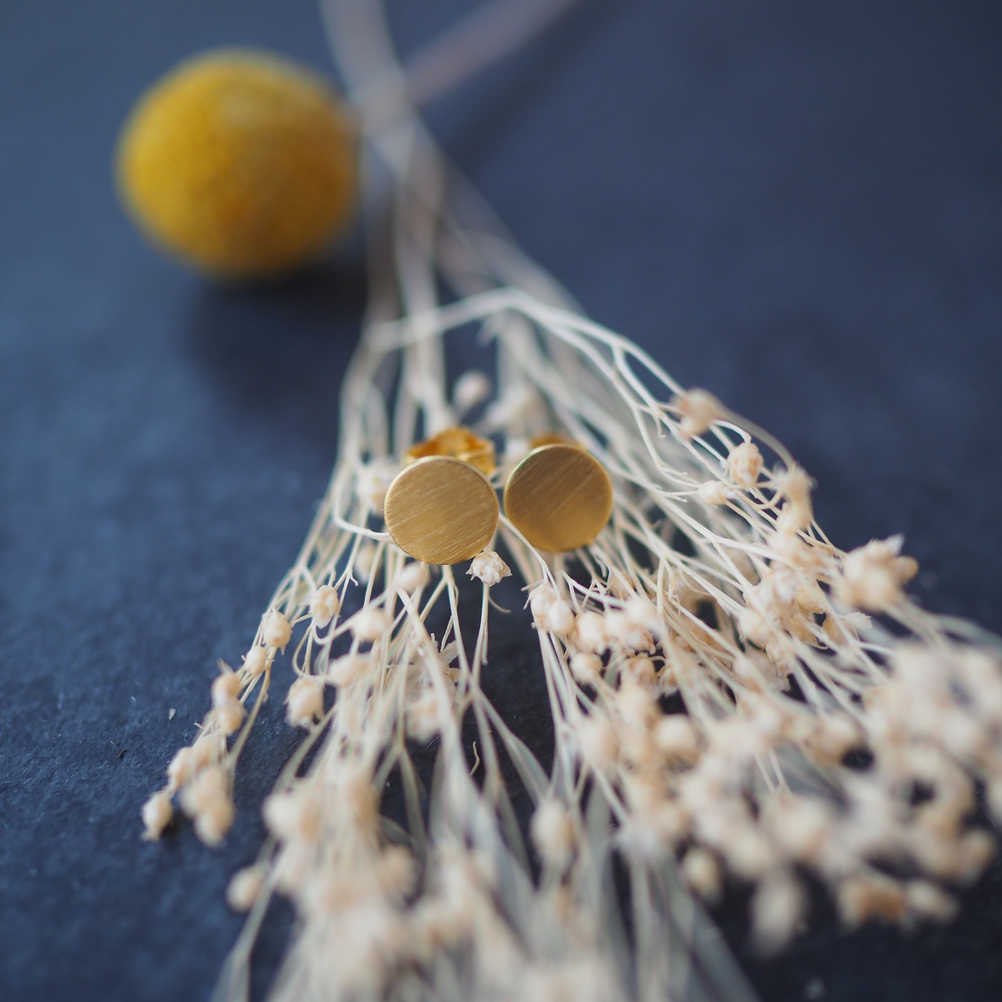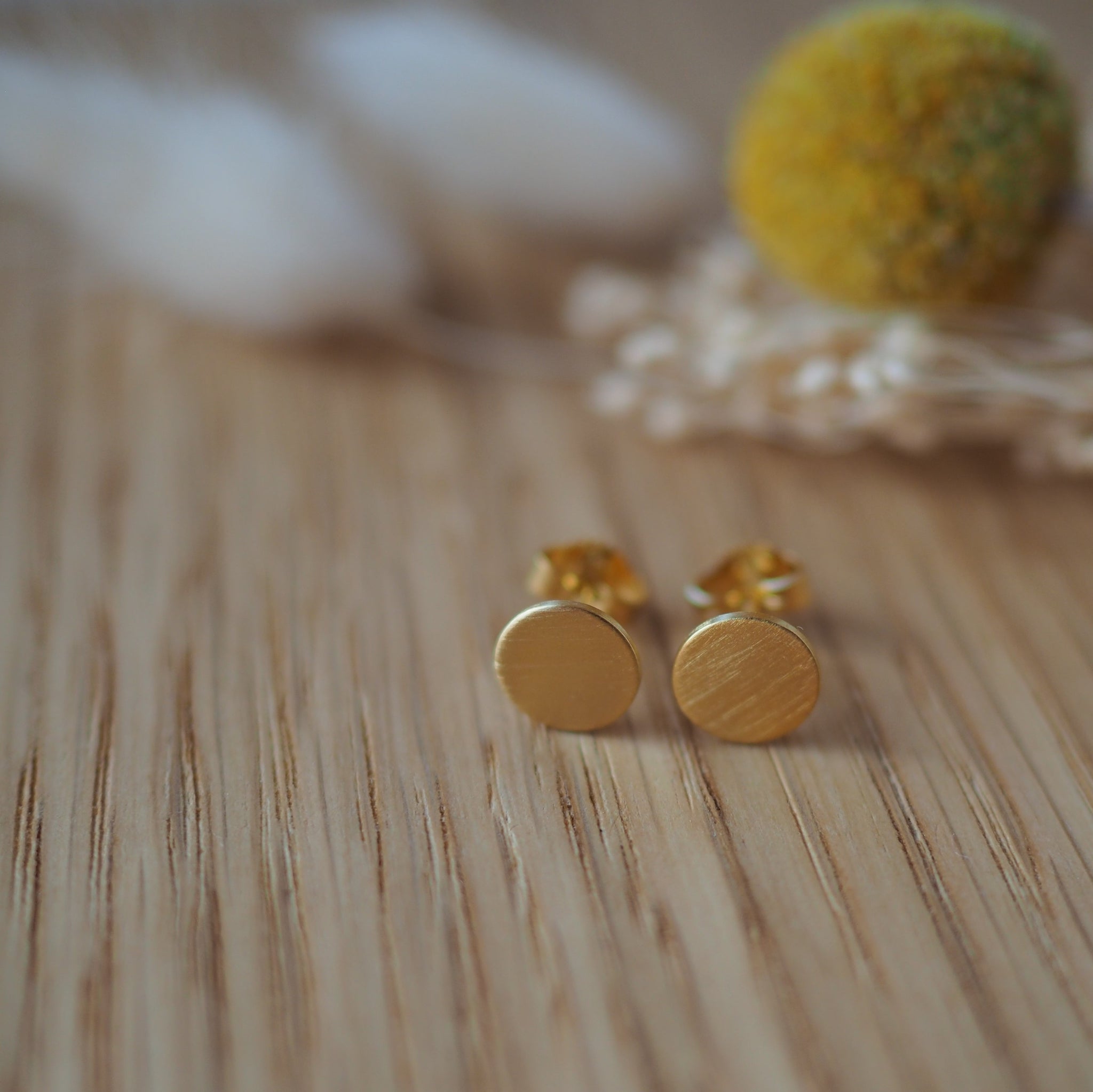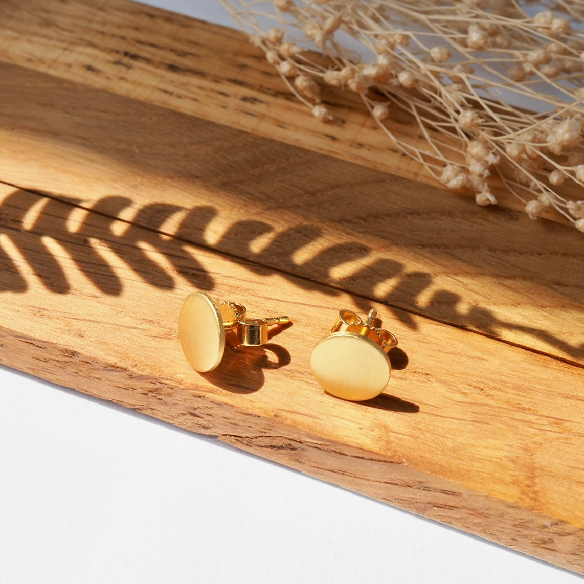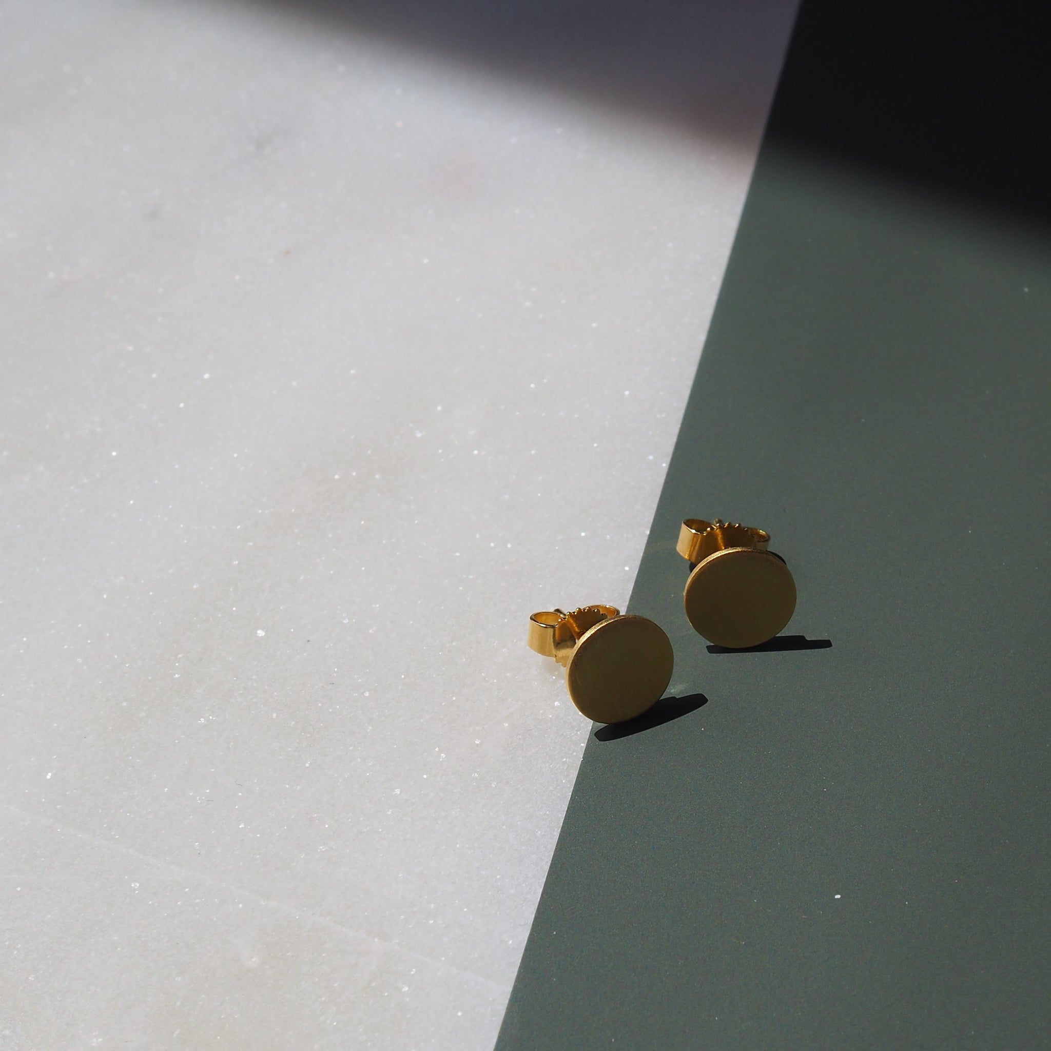 Die Stecker sind aus Sterling Silber gefertigt, werden anschließend mit 750er Gold vergoldet und erhalten dann ihr mattes Finish. Die Größe der Stecker ist 8mm im Durchmesser, so sind sie gut aber dezent sichtbar.